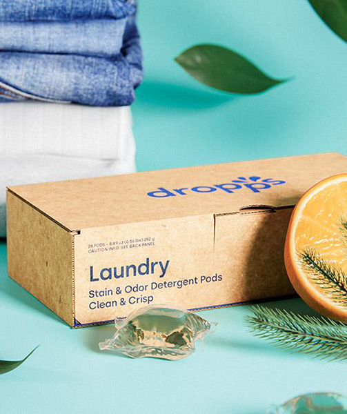 Laundry detergent pods with natural enzymes and plant-based ingredients. Cardboard packaging designed to minimize waste.