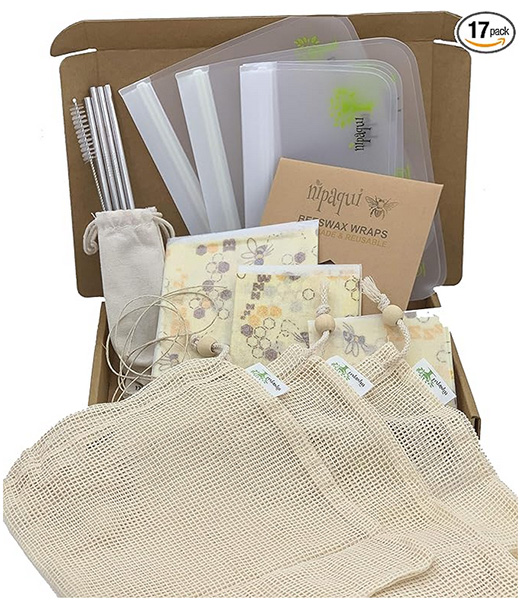 17 piece Eco Friendly Set includes Reusable Products, Food Storage Bags, Beeswax Wraps, Mesh Produce Bags, and Straws.